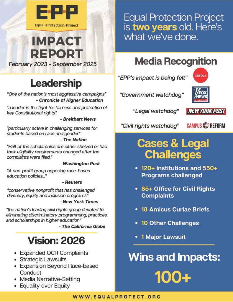 Since launch in Febuary 2023, the Equal Protection Project has had a tremendous impact advancing the cause of equality and equal protection of the laws.