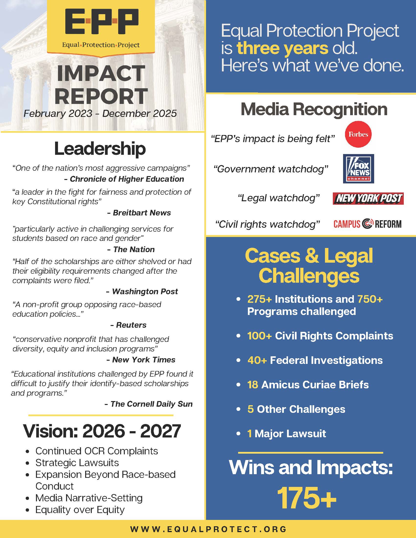 Since launch in Febuary 2023, the Equal Protection Project has had a tremendous impact advancing the cause of equality and equal protection of the laws.
